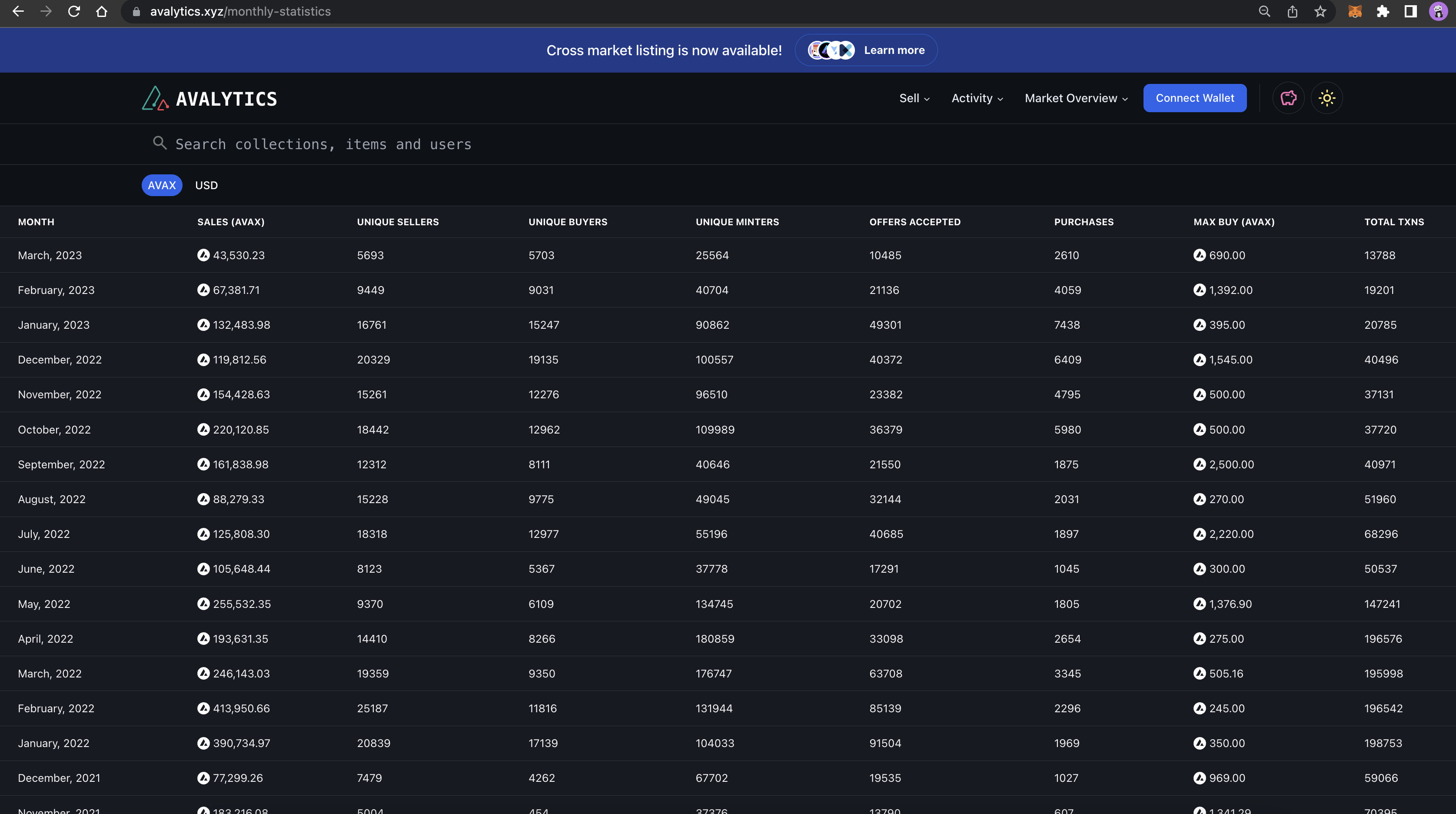 Interested in examining the performance of the Avalanche NFT market on a monthly basis? We are pleased to inform you that Avalytics now offers comprehensive monthly reports, complete with daily statistical insights for your convenience [here](https://www.avalytics.xyz/monthly-statistics)**.** To access daily reports for a specific month, simply select the desired month, and you will be presented with detailed statistical data for each day within that time frame. You can easily switch between AVAX & USD to view sales volume in either cryptocurrency.